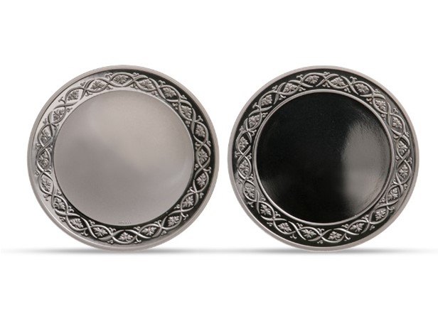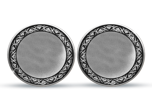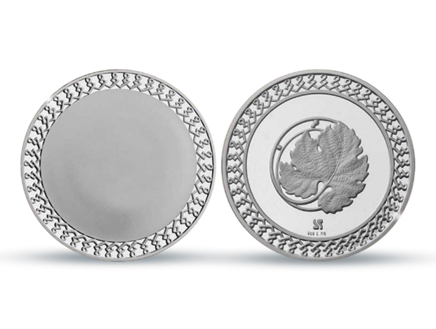 Színezüst széldíszes érem, elő- és hátoldala szöveggel véshető vagy színes képpel/logóval nyomtatható