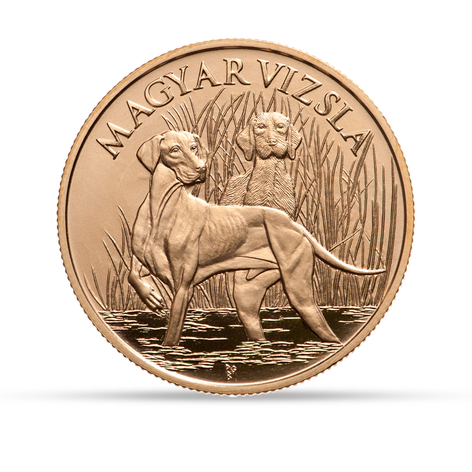Hátlap:Az emlékérme hátlapján vadászjelenet elevenedik meg. Vadászkutyaként a vizsla ún. mindenes fajta, de elsősorban az apró vad elejtésében jeleskedik mezei, illetve vízi munkában. A hátlapon az előtérben, egy vízben lépdelő rövidszőrű magyar vizsla – jellegzetes „vadat álló” testtartásban –, a háttérben egy nádasból kilépő drótszőrű magyar vizsla ábrázolása látható. Felső félköriratban a kutyafajta elnevezése, a „MAGYAR VIZSLA” olvasható.