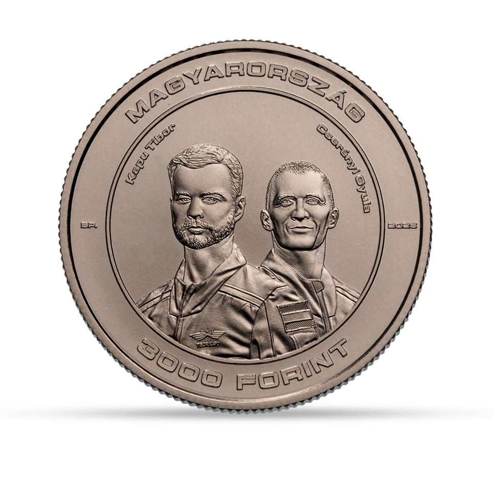 Előlap: Az előoldal Kapu Tibor kutatóűrhajóst és Cserényi Gyula kiképzett kutató-űrhajóst ábrázolja félprofilból. Az előoldalon találhatók az emlékérme kötelező alaki kellékei: a „MAGYARORSZÁG” felirat, a „3000” “FORINT” értékjelzés, a „2025” verési évszám és a „BP.” verdejel.
